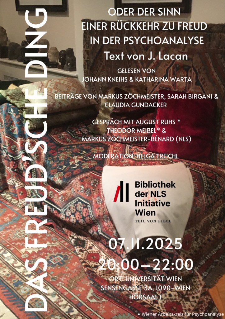 7. November 2025: Lesung: Das Freudsche Ding. , eine Veranstaltung der Bibliothek der Initiative NLSWien, zum 70. Jubiläum des Vortrags von Jacques Lacan in Wien